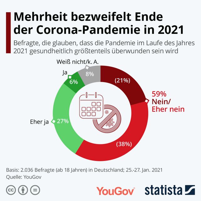 Die Mehrheit der Deutschen bezweifelt jedoch, dass die Corona-Pandemie bis zum Jahresende überwunden sein wird. Nach einer Umfrage des Meinungsforschungsinstituts YouGov in Zusammenarbeit mit dem Marktforschungsinstitut Statista glauben 59 Prozent der Befragten nicht an ein Ende der Pandemie 2021. Ein Drittel (33 Prozent) zeigte sich dagegen optimistisch. Acht Prozent machten keine Angaben.