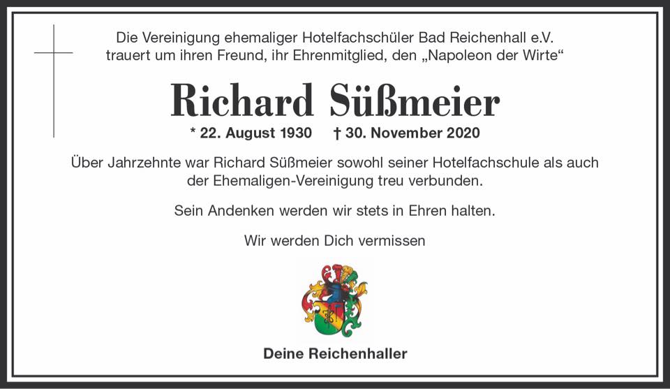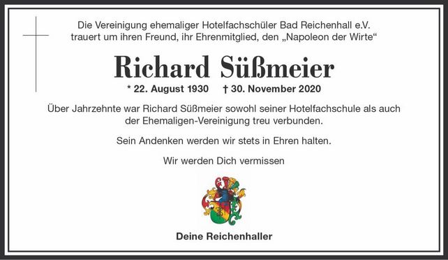 Oktoberfest- und Wirte-Legende Richard Süßmeier ist am Montag, wenige Monate nach seinem 90. Geburtstag, gestorben. Dies bestätigte eine Sprecherin des Bayerischen Hotel- und Gaststättenverbandes der Deutschen Presse-Agentur unter Berufung auf Co-Wiesnwirte-Sprecher Christian Schottenhamel. Zuvor hatte die «Bild»-Zeitung berichtet.
