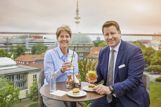 Eugen Block und seine Tochter Christina haben auf dem Dach des Grand Elysée Hamburg eine neue Location geschaffen, die die Vielfalt der Gastronomie des Hauses ergänzen soll. Das Investitionsvolumen für die Dachterrasse, die sich als siebte „Freiluft-Etage“ des sechsgeschossigen Hotels über 150 Quadratmeter und zwei Ebenen erstreckt, betrug eine Million Euro.