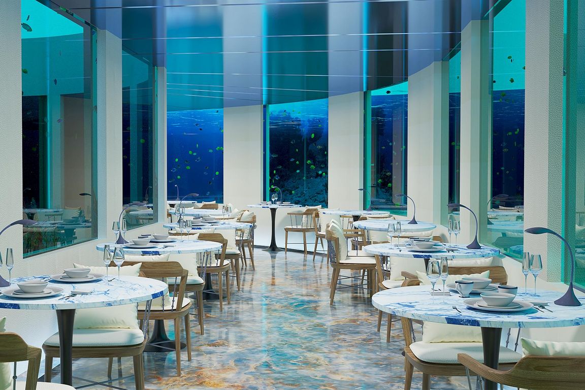 Der Zugang zum Restaurant erfolgt über einen Holzsteg zwischen den beiden neuen Inselresorts im Nord Malé Atoll. In fast sieben Metern unter dem Meeresspiegel gelegen, verfügt das Only BLU über eine Fläche von 190 Quadratmeter und bietet Platz für 46 Gäste. Sein hufeisenförmiges Design garantiert jedem Tisch einen eigenen Fensterblick auf das Korallenriff. Die Farben, Muster und Texturen des Interieurs sind so gewählt, dass sie die Aussicht auf das Meer ergänzen.
