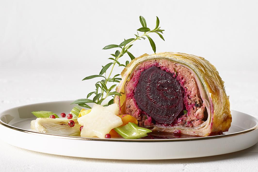 Starter wie gefüllte Crêpes oder Rote-Bete-Macarons können problemlos vegan zubereitet werden. Die winterlichen Beilagen festlicher Hauptgerichte wie zum Beispiel Rotkohl, Maronen und Kartoffelpüree lassen sich mit wenigen Schritten in eine vegane Rotkohlsuppe mit glasierten Maronen und Mini-Knödeln verwandeln. Der Klassiker Beef Wellington kann mit veganem Blätterteig und einer Füllung aus Raw No Mince und Roter Bete zubereitet werden, als Beilage gibt es Wintergemüse und Barolo-Jus. Für die Variante mit Fleisch wird die Rote Bete einfach durch entsprechendes Filet ausgetauscht. Für das Dessert bietet sich beispielsweise veganer Bratapfel an.