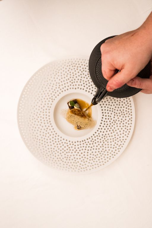 Den Auftakt bilden ein kalter Ramen-Shot und eine mit Brühe gefüllte Praline, gefolgt von Gängen wie bretonischer Jakobsmuschel mit schwarzem Knoblauch-Öl in einer Tonkotsu-Reduktion. Die Verwendung hochwertiger Produkte zeigt sich zudem bei Bluefin Thunfisch mit frischem Wasabi oder Wagyu-Rind aus Kagoshima, das auf einem traditionellen Konro-Grill mit Binchotan-Kohle zubereitet wird. Französische Einflüsse fließen durch Techniken wie eine Umeboshi-Beurre-Blanc oder die Kombination von Sake-Kasu-Eis mit klassischen Dessert-Elementen ein.