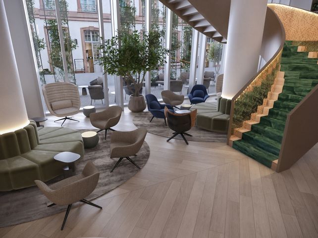Die Neugestaltung des JW Marriott Frankfurt greift die historische Bedeutung des Standorts auf, an dem einst die Gärten des Palais Thurn und Taxis lagen. Das Frankfurter Architekturbüro Rosen integriert natürliche Materialien und grüne Elemente, um die Natur in das Innere des Hotels zu holen.