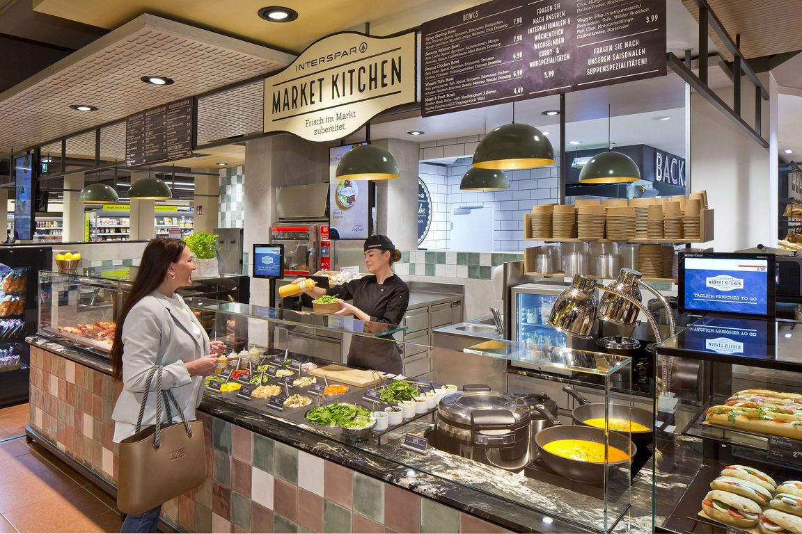 Unter der Dachmarke SPAR enjoy führt Interspar seit Jahren ein Sortiment an Convenience-Produkten. Jausenbrote, Müslis und variantenreiche Salate werden ergänzt durch internationale Spezialitäten wie zum Beispiel Hummus und Falafel von SPAR enjoy by NENI sowie die neuesten Trends wie zum Beispiel Jackfruit Wraps mit Kichererbsen oder Bulgur-Quinoa-Salat mit Karfiol und schwarzen Bohnen. Mit der Interspar-Market Kitchen geht Österreichs führender Hypermarktbetreiber nun einen Schritt weiter: Im Herzstück des Markts finden Kundinnen und Kunden ab sofort eine offene Küche. Im Angebot: Warme und kalte Gerichte zum Mitnehmen, die nach dem Front-Cooking-Prinzip frisch vor den Augen der Kundinnen und Kunden im Markt zubereitet werden.