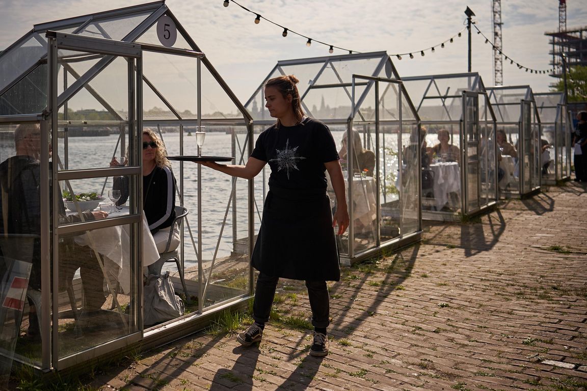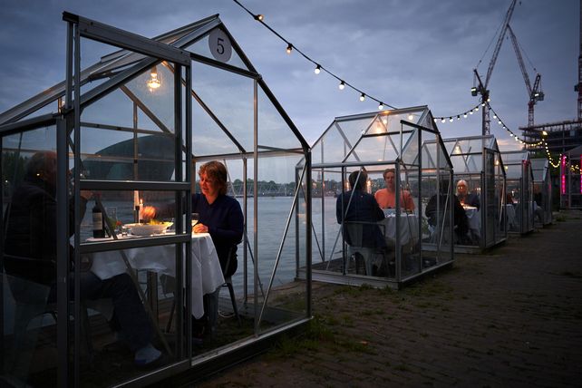 Eine kreative Lösung für das Abstandsproblem hat das vegane Restaurant „Mediamatic Eten“ im Kunst- und Kulturzentrum in Amsterdam gefunden: Die Gäste werden in kleinen Glashäusern bewirtet. Bis zu drei Gäste sollen in die Gewächshäuschen passen. Es seien sehr kleine, intme Ecken, so der Betreiber.