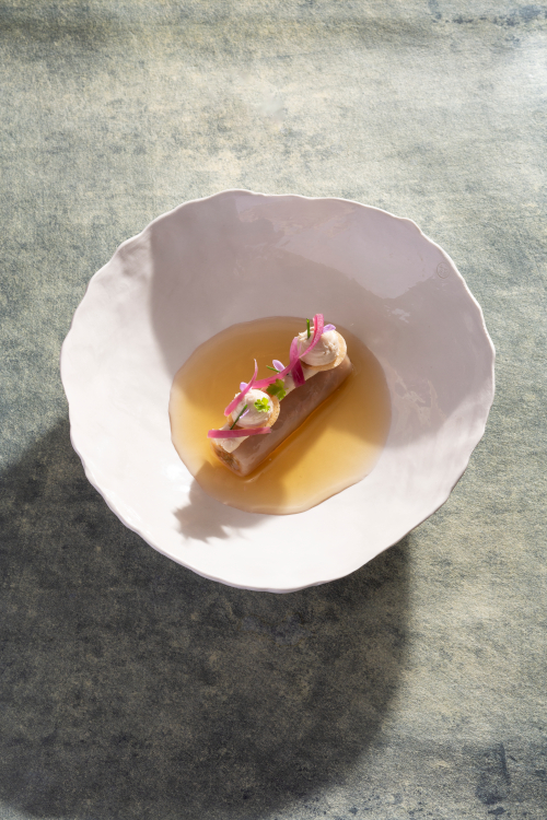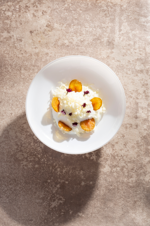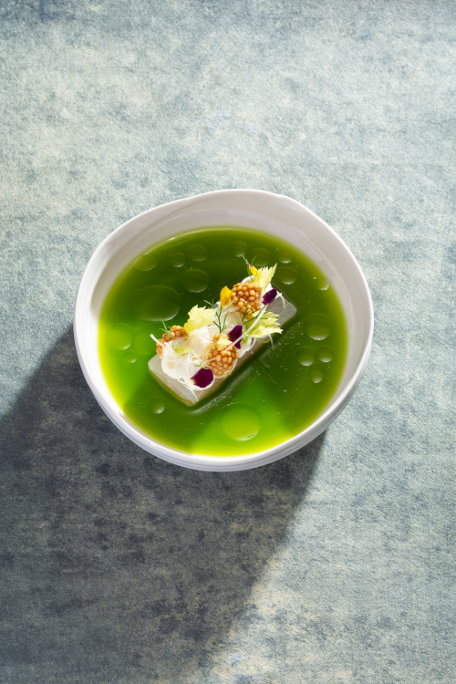 Einzelne „Helden“, wie Sellerie oder Karotte, kommen in verschiedenen Zubereitungsweisen immer wieder im Menü vor – kunstvoll, überraschend und neugierig machend auf den nächsten Gang. Für die aromatische Einstimmung des Gaumens auf das direkt nachfolgende Geschmackserlebnis auf dem Teller sorgen die „Vorboten“. Sie bestehen aus denselben Komponenten wie das kommende Gericht und sind doch überraschend anders interpretiert.