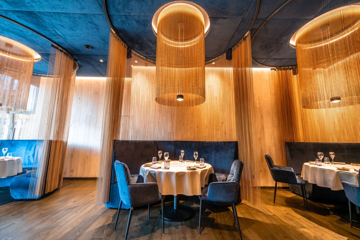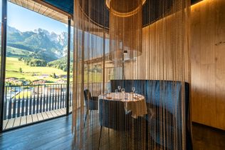 So sehr sich das Lokal mit seiner Glasfront zur Bergwelt hin öffnet, so intim und privat wirkt jeder der sechs runden Tische. Erst wenn der Gast Platz nimmt, öffnet sich der zarte Kettenvorhang, der jedes der kleinen Genuss-Separees umschließt. Eine speziell entwickelte Akustikdecke unterstreicht die sehr persönliche, ruhige Atmosphäre.