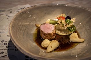 Die vier oder sechs Gänge (€ 95,-- oder € 115,--) auf teils speziell gefertigtem Geschirr einer Salzburger Keramikkünstlerin haben zudem historische und geografische Bezüge zur Geschichte Leogangs. Vom Bergbau bis zu jenen Zeiten, als das Eis vom Birnbachloch zur Bierkühlung nach München per Eisenbahn gebracht wurde. Letztere, in Miniatur speziell gefertigt, hat nun Häppchen für den Gast geladen. Und das durchaus mit Augenzwinkern, den eines dieser Häppchen ist versteckt und will erst gefunden werden.