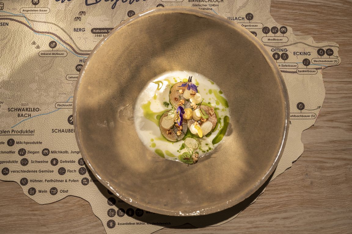So kommen Gemüseraritäten vom Stechaubauern in der Nachbarschaft, Wild von befreundeten Jägern der Gemeindejagd, Lamm wird exklusiv beim Vorderrainerbauer gezüchtet, Rind bei anderen Leoganger Bauern. Bei Wildhühnern und Duroc-Schweinen gibt es ein gemeinsames Projekt mit dem Schattbachbauer, Forelle und Saibling kommen von den Leoganger Fischzüchtern Grundner und Hasenauer, der österreichische (!) Wolfsbarsch stammt von einem steirischen Biozüchter, die Enten aus Straden und sogar für Reis wurde mit Jakob Winter ein Jungbauer gefunden, der diesen nachhaltig in Niederösterreich (!) kultiviert, um nur einige Beispiele zu nennen. Gleiches gilt für Käse, Honig, Joghurts, Säfte und vieles mehr.
