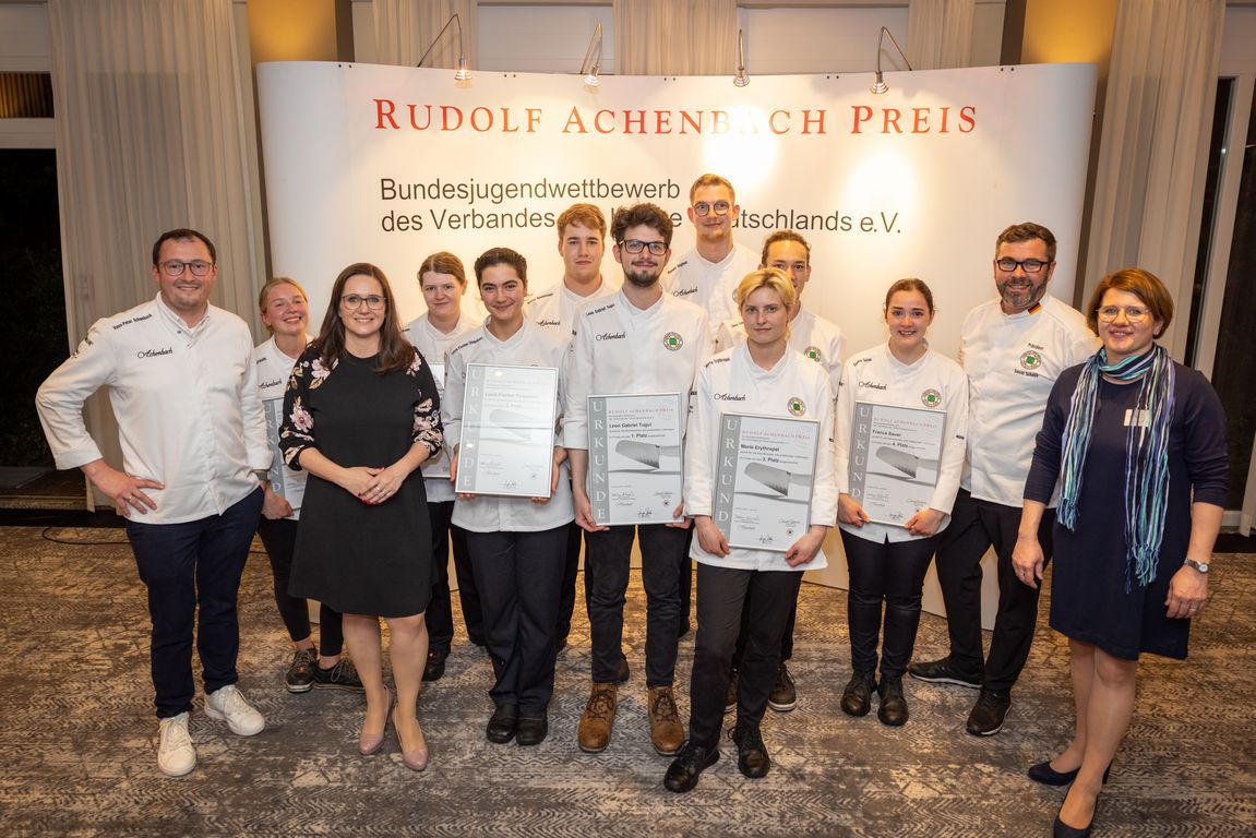 Alle Auszubildenden überzeugten durch ihre hervorragenden Leistungen. Mit Leidenschaft, Kreativität und Können zauberten sie Speisen auf die Teller, die Jury und Gäste beim abschließenden Dinner begeisterten. Sie waren geprägt von pflanzlichen Zutaten und internationalen Einflüssen und ließen eine Vielzahl von Aromen und Geschmacksrichtungen entdecken. Katrin Achenbach, Enkelin des Firmengründers und Geschäftsführerin der Delikatessen-Manufaktur, zeigte sich beeindruckt und betonte bei der feierlichen Preisverleihung im Best Western IB Hotel Friedberger Warte die Bedeutung dieses Wettbewerbes für die angehenden Köchinnen und Köche: „Der Rudolf Achenbach Preis lädt dazu ein, eigene Fähigkeiten auf ein neues Level zu heben und sich schon früh einen Namen zu machen. Jungen Menschen dieses Sprungbrett zu bieten, hat unsere Familie schon immer als ihre Aufgabe gesehen.“ Dem pflichtete Daniel Schade, Präsident des Verbands der Köche Deutschlands, bei: „Wir sind stolz auf die langjährige Tradition dieses bedeutsamen Wettbewerbs und die gute Zusammenarbeit mit der Achenbach Delikatessen-Manufaktur. In den letzten Jahren haben wir gemeinsam schwere Zeiten gemeistert und ich bin zuversichtlich, dass der Rudolf Achenbach Preis als Bundesjugendwettbewerb des VKD auch in Zukunft eine stabile Größe der Branche sein wird. Den Azubis, die bei dieser 47. Auflage teilgenommen haben, und ihren Ausbilder:innen möchte ich Danke sagen. Sie haben mit großartigen Leistungen auf den Tellern eindrucksvoll unter Beweis gestellt, wie engagierter Berufsnachwuchs aussehen kann.“