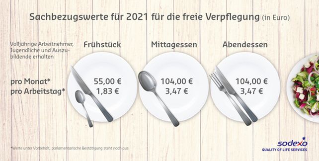 Die erhöhten Sachbezugswerte folgen dem Verbraucherpreisindex für Kantinen und Gaststättendienstleistungen und gleichen somit die Teuerungsrate aus. Arbeitstäglich profitieren mehr als 9,5 Millionen Arbeitnehmer als Nutzer von Betriebsrestaurants und Kantinen und rund 1 Million Verwender von Restaurantschecks und der Sodexo Restaurant Pass Karte von den neuen Steuerwerten.