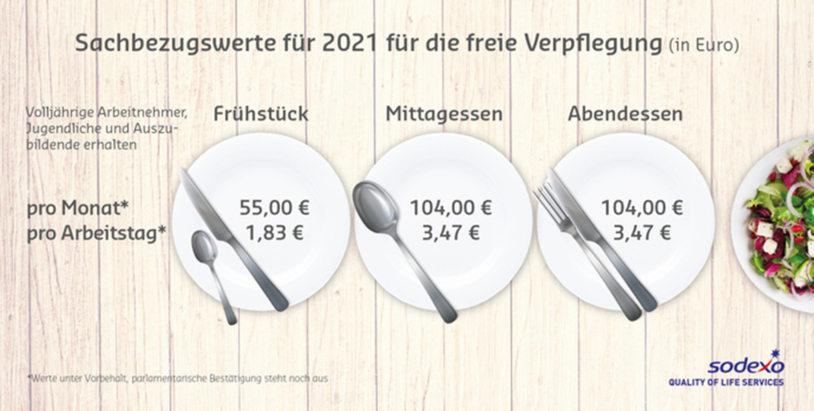 Die Sozialversicherungsentgeltverordnung regelt, dass bestimmte Sachleistungen und geldwerte Vorteile in der Sozialversicherung begünstigt werden. Diese so genannten Sachbezugswerte werden von der Bundesregierung jedes Jahr auf der Basis der Entwicklung der Verbraucherpreise neu festgesetzt. Zum 1. Januar 2021 sollen für alle Bundesländer neue amtliche Sachbezugswerte zur Anwendung kommen: Der Monatswert für Mahlzeiten steigt auf 263 Euro, der Wert für die arbeitstägliche Verpflegung beim Mittagessen wird auf 3,47 Euro erhöht.
