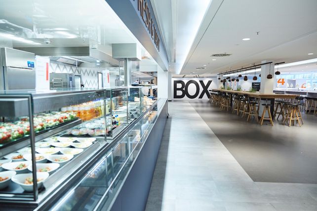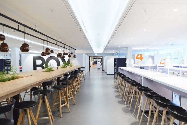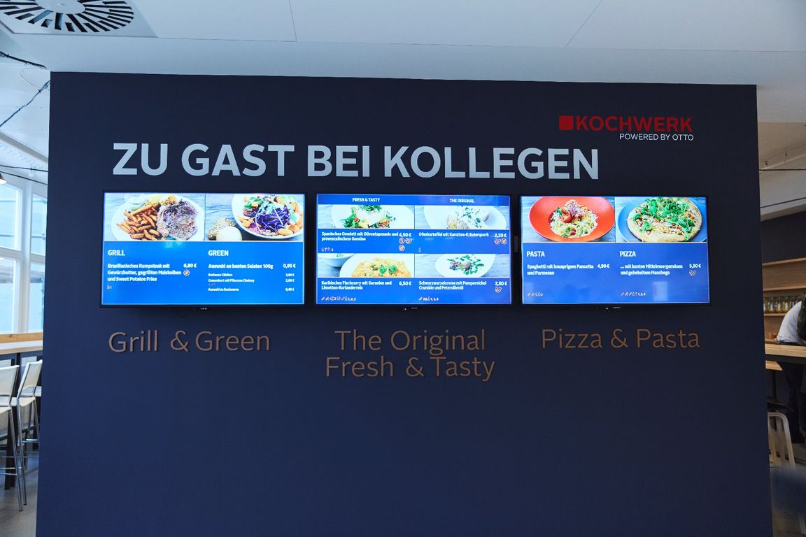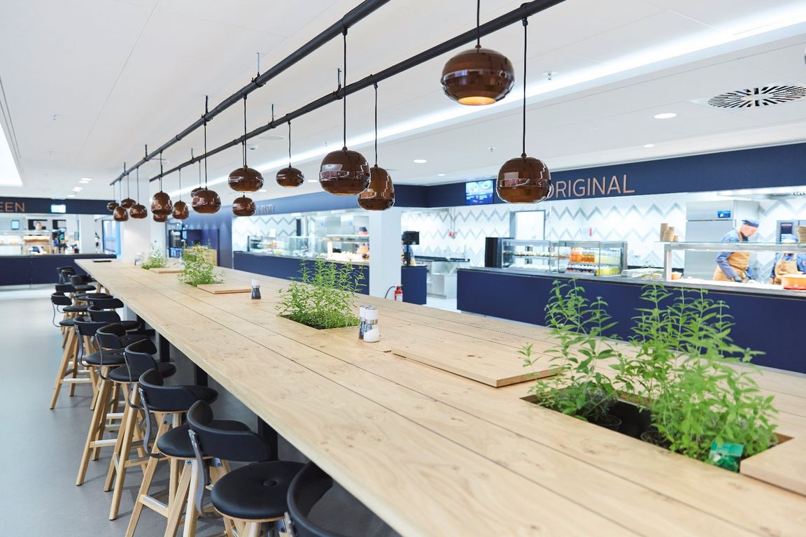 Es liegt nicht nur am Essen, dass es die OTTO-Mitarbeiter in die „Elbe“ zieht: Die helle Gestaltung der Bereiche und die moderne, im skandinavischen Stil gehaltene Einrichtung tragen zum Wohlfühlfaktor bei. Der Gastraum gliedert sich in mehrere Bereiche: Lange Community-Tables fördern Interaktion und Kommunikation. Wer es zur Mittagszeit lieber ruhiger angehen lässt, findet in kleinen Nischenplätzen mehr Privatsphäre. Neben der neuen Essens- hat auch die neue Arbeitswelt Einzug in die „Elbe“ gehalten: Die Zone „Confeatery“ („Conference + Eatery“) dient außerhalb der Kantinenzeit als zusätzlicher Raum für Besprechungen und Workshops: Für Präsentationen steht ein 98-Zoll-Monitor zur Verfügung, die Rückseiten der mobilen Sitz-Cubes fungieren als Whiteboard.