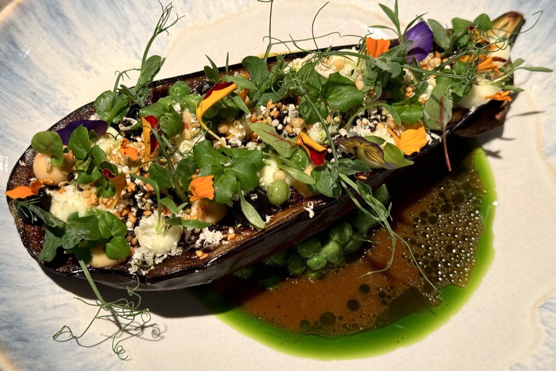 Ausgezeichnet für: Geschmorte Aubergine – Tandoori-Bouillon, Miso, Meerrettich, Erbsen (Gemüseküche).