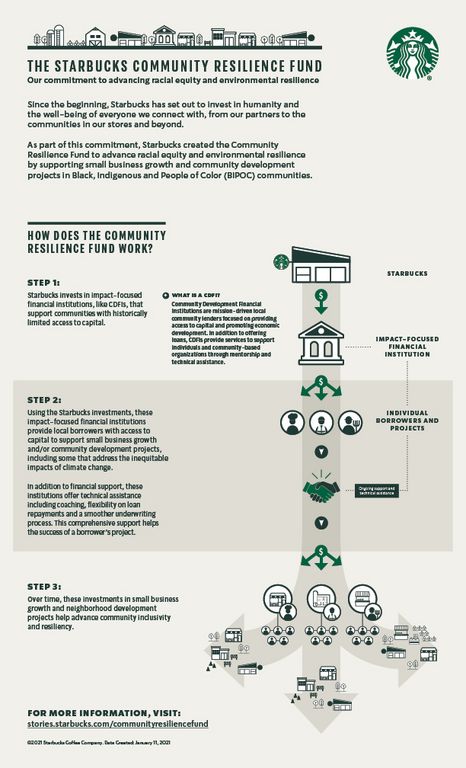 Starbucks will in den USA 100 Millionen Dollar investieren, um den Starbucks Community Resilience Fund ins Leben zu rufen. Dieser fokussiert sich auf die Unterstützung von kleinen Unternehmen in Vierteln von Schwarzen, Indigenen und People of Color. Darüber hinaus geht Starbucks eine Partnerschaft mit dem Smithsonian's National Museum of African American History and Culture ein, um die Bildungsressourcen des Museums und digitale Möglichkeiten für Freiwillige zu unterstützen.