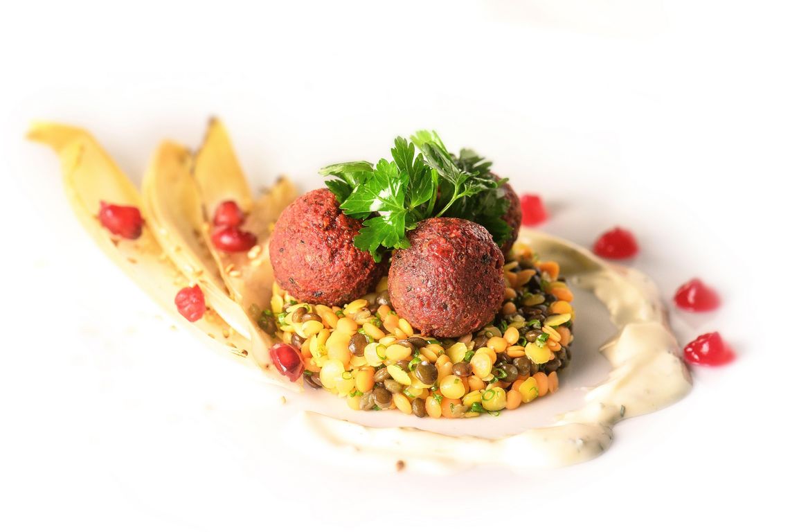 Der Hauptgang setzt auf Saisonales von Kalbsrücken und Ochsenbäckchen an winterlichem Wurzelgemüse mit Waldpilz-Serviettenknödel – verfeinert mit getrüffelter Spätburgunder-Jus. Zum Dessert dürfen die Gäste Michael Jacksons Lieblingsspeise „Carrot Cake“ in karamelisierter Version mit Gewürzorangen, Haselnusseis und Minzhippe genießen. Dass Scharff auch vegetarisch auf gleich hohem Niveau kochen kann, hat er 16 Jahre lang bei der Berlinale unter Festivaldirektor Dieter Kosslick bewiesen. Vegetarier können sich daher zur Vorspeise auf ein Orientalisches Dreierlei aus Roter Beete Falafel auf buntem Linsensalat, marinierter Blattpetersilie und gebratenem Chicorée an Granatapfel freuen. Als Hauptgang gibt es gefüllte Aubergine mit Schafskäse auf Bulgur, Tomaten-Oliven-Sugo, Auberginenkaviar und geröstete Pistazien. Die Qualität seines Menü kontrolliert Scharff an allen Spieltagen persönlich: „Ich bin jeden Abend des Gourmet Varietés selbst in der Küche, begrüße die Gäste und verabschiede sie auch wieder.“