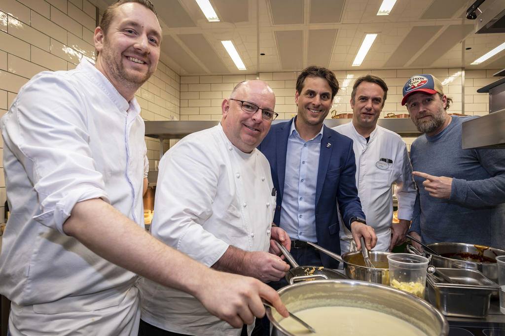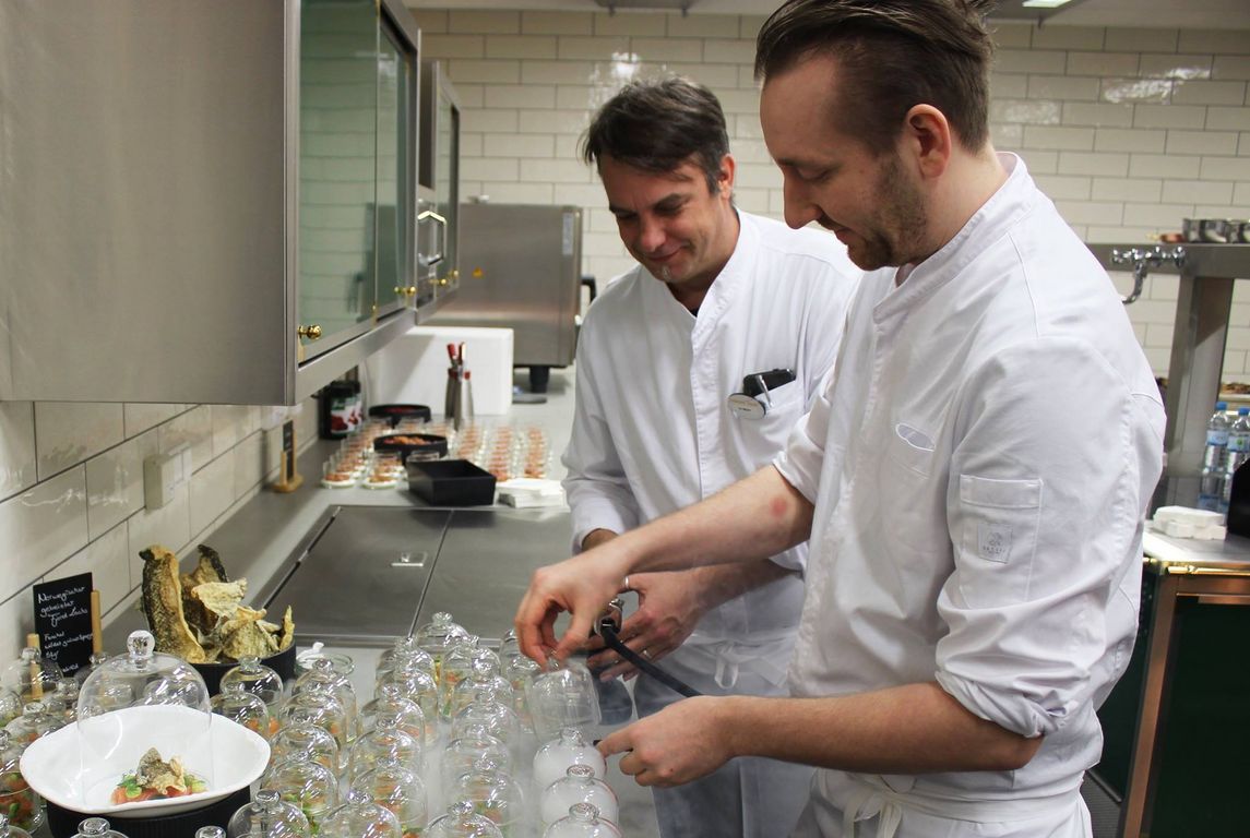 Zu verkosten gab es unter anderem norwegischen Räucherlachs mit Fenchel und frittierter Fischhaut sowie geschmorte Ochsenbacken mit Chicoree und Aubergine. „Es ist ein schönes Gefühl, in so einer tollen Designer-Küche die ersten Handgriffe zu tätigen – das fühlt sich richtig gut an“, sagte Scheibel. Bis zu 220 Sitzplätze bietet das Fine-Dining Restaurant im Innen- und 140 Sitzplätze im Außenbereich.