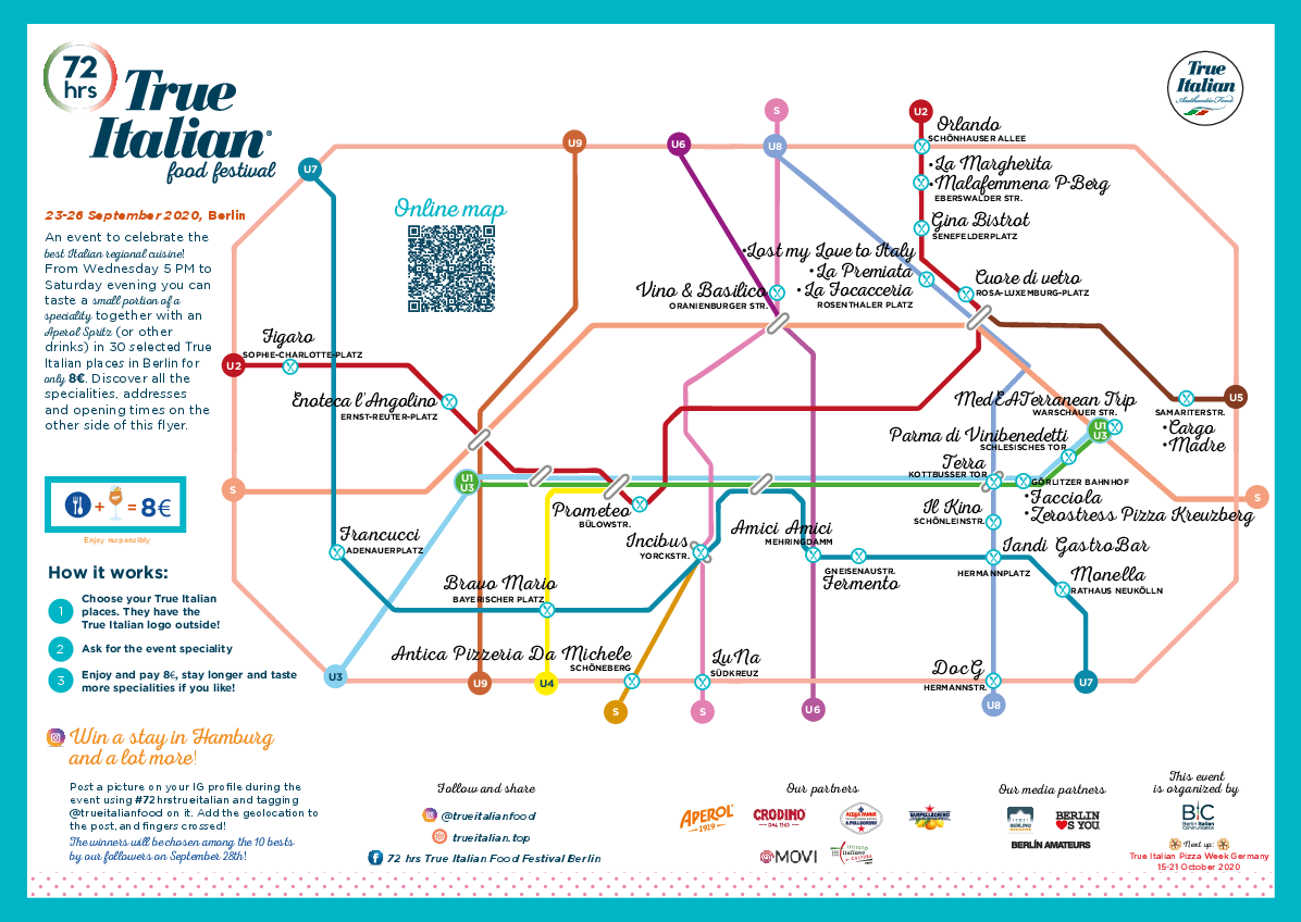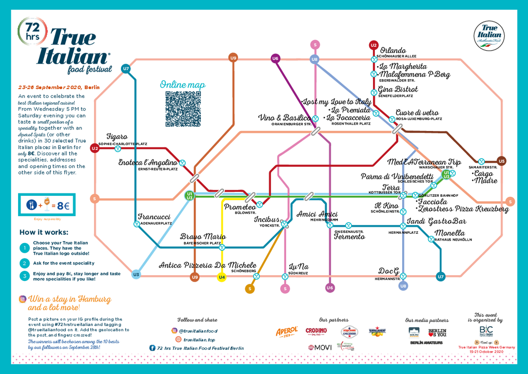 Beim «True Italian Food Festival 2020» gibt es in den Restaurants eine kleine Portion dieser Spezialitäten zusammen mit einem Aperol Spritz, einem Glas Wein oder einem Softdrink für jeweils acht Euro. Wegen der Coronavirus-Pandemie bieten fast alle teilnehmenden Lokale das Event-Menü auch zum Mitnehmen. Daneben gibt es auch das übliche Menü.