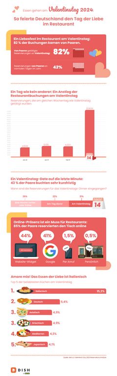DISH Digital Solutions, eine Tochter der Metro AG, hat die die Art und Weise untersucht, wie der Valentinstag in Deutschland gefeiert wird. Dadurch soll auch die Bedeutung der Online-Präsenz für die Gastronomie unterstrichen werden. Mit der Vorliebe für eine breite Palette an landestypischen Küchen und der Neigung zu spontanen sowie geplanten Reservierungen hätten Gastronomen die Möglichkeit, diesen Tag zu einem besonderen Erlebnis für ihre Gäste zu machen.