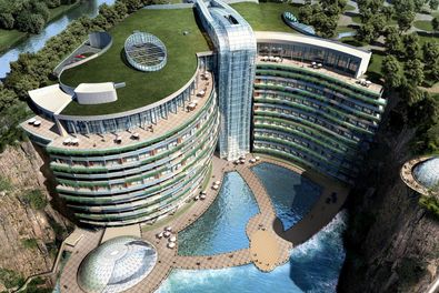 Die InterContinental-Gruppe eröffnet in China das Shanghai Wonderland. Das spektakuläre Luxushotel liegt in einem ehemaligen Steinbruch im Südwesten Shanghais. Von 18 Stockwerken befinden sich nur zwei Etagen oberhalb der Erdoberfläche, zwei Etagen liegen sogar unter Wasser. (Mit Video)