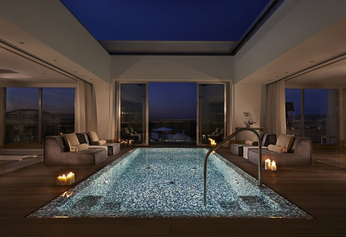 Darüber hinaus bietet die Suite einen eigenen Eingang und Aufzug, eine exklusive Brücke zum Spa des Hotels sowie eine großzügige Dachterrasse, ein privates Saunadampfbad, eine komplette Küche und einen persönlichen Butlerservice.