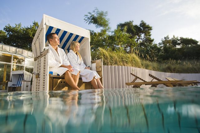 Ideal auch die Hotellage unmittelbar am Ostsee-Strand: Nur wenige Schritte genügen, und schon können die Kleinen im Meer baden, Sandburgen bauen, Drachen steigen lassen oder einfach an der frischen Seeluft herumtoben. Zusätzlichen Badespaß garantiert der kostenfreie Zugang zur hoteleigenen Bernsteintherme: Hier lässt sich mit der ganzen Familie bei angenehmen 32 Grad Wassertemperatur plantschen. Zwei große Schwimmbecken, ein Außenpool und ein Spray-Park für Kinder sowie für die Eltern Usedom größter Saunabereich.