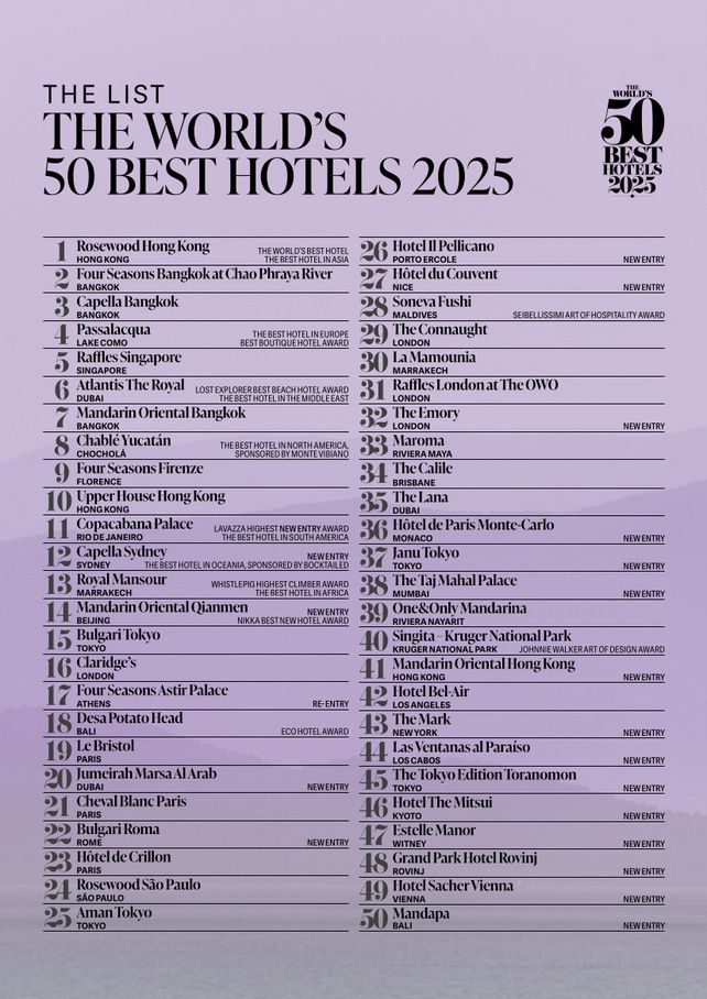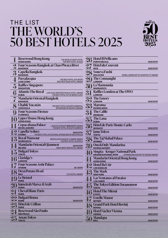 Emma Sleight, Head of Content für The World's 50 Best Hotels, kommentierte: "Wir freuen uns, Rosewood Hong Kongs Spitzenposition bekannt zu geben – ein Haus, das seit der Einführung der Auszeichnungen im Jahr 2023 unter den Top Drei vertreten war. Dieses außergewöhnliche Hotel bietet erstklassigen Service und sensationelle Gästeerlebnisse im Herzen einer der geschäftigsten und dynamischsten Destinationen der Welt. Die Positionierung des Rosewood Hong Kong als Nr. 1 festigt Asien weiter als führende Luxusreisedestination für Geschäfts- und Urlaubsreisende.".