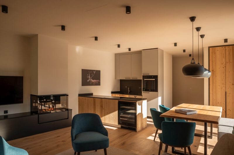 Das Haus wartet mit 124 Suites und Lodges auf und bietet einen 1.100 Quadratmeter großen Wellnessbereich. Eine Holzfassade kleidet das Hotel elegant ein. Das Interieur ist in sanften Taupe-, Braun- und Blautönen gestaltet. Die Größe der Suites variiert von 35 m² bis 172 m², während die Lodges zwischen 125 m² und 152 m² messen. In den größeren Suites befindet sich auch eine hochwertige von Schreinerhand gefertigte Küche. Es stehen jeweils zwischen ein und vier Schlafzimmer sowie ein bis drei Badezimmer zur Wahl. In den Wellness-Suites und in den Lodges gibt es darüber hinaus eigene Saunen.