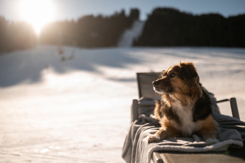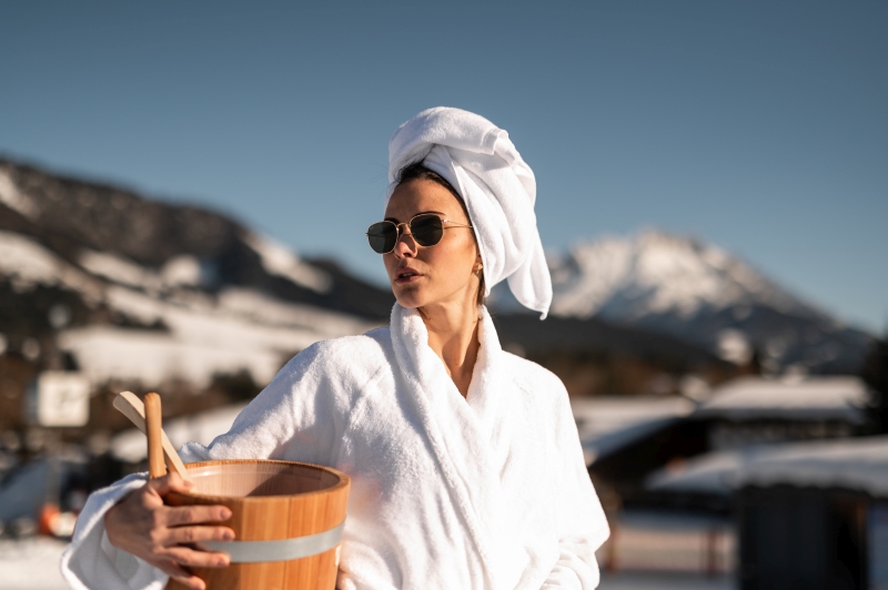Auf 1.100 m² verteilen sich zwei Saunen, eine Infrarotkabine, ein Indoorpool sowie ein Ruhebereich und ein Atrium zum Abkühlen nach dem Saunagang. Durch das Panoramafenster der finnischen Sauna fällt der Blick auf die Berge.