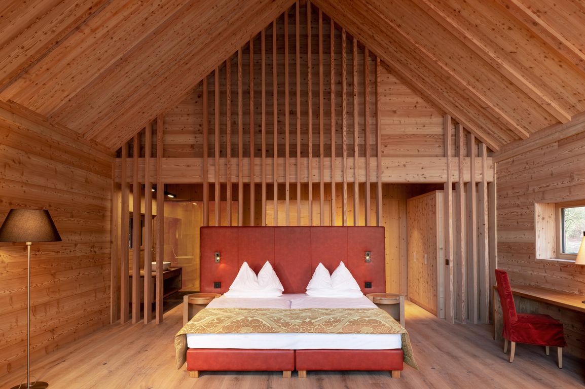 Das Hauptgebäude öffnet sich zum Tal hin. Ihm vorgelagert sind die weiteren Bereiche der Lodge. Links zwei Gebäude mit jeweils zehn Junior Suiten, die beide über einen unterirdischen Zugang zum Hauptgebäude verfügen. 20 Chalets gehören ebenfalls dazu, zehn mit einem Schlafraum, zehn weitere mit zwei Schlafräumen. Ihre Satteldächer haben keinen Überstand und wirken dadurch hochmodern. Auch im Inneren gibt es keine Schnörkel.