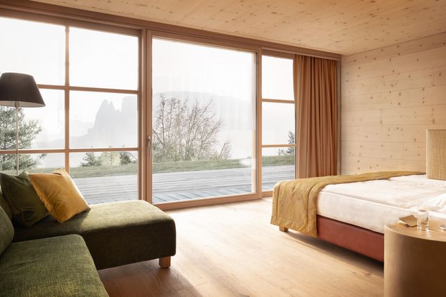 Und doch unterscheidet sich die neue Adler Lodge Ritten. Mit der Holffassade lehnt sich ihr Design an eine für den Ritten typische Architektur an. Visualisiert wurde die neue Lodge von Klaus und Andreas Sanoner. Der Architekt Hugo Demetz hat die Familie Sanoner wie bereits auf der Seiser Alm beraten und das Projekt begleitet. Auffallend sind die hohen Decken und die offenen Raumkonzepte. Im Haupthaus wird es auf drei Ebenen umgesetzt. Unten das Spa mit Fitness, Ruhezonen und einem vorgelagerten Aussenpool, der ganzjährig beheizt ist. Auf mittlerer Ebene die Rezeption, die Bar und das Wohnzimmer der Lodge. Ganz oben das Restaurant mit offener Küche.