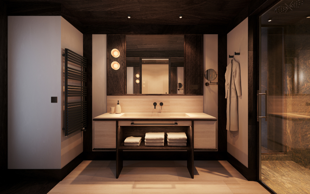 Für das Interior Design zeichnet das Studio Astet aus Barcelona verantwortlich. Die Gestaltung orientiert sich an den natürlichen Kontrasten der alpinen Umgebung. Zum Einsatz kommen Materialien wie Holz, Stein und Stahl, kombiniert mit klaren Linien und zeitgenössischer Eleganz. Das Konzept interpretiert den klassischen Chalet-Charakter modern. Die Räume sollen sowohl in der alpinen Tradition verwurzelt als auch in der Gegenwart verankert sein und ein tieferes Eintauchen in die Aethos-Welt ermöglichen.