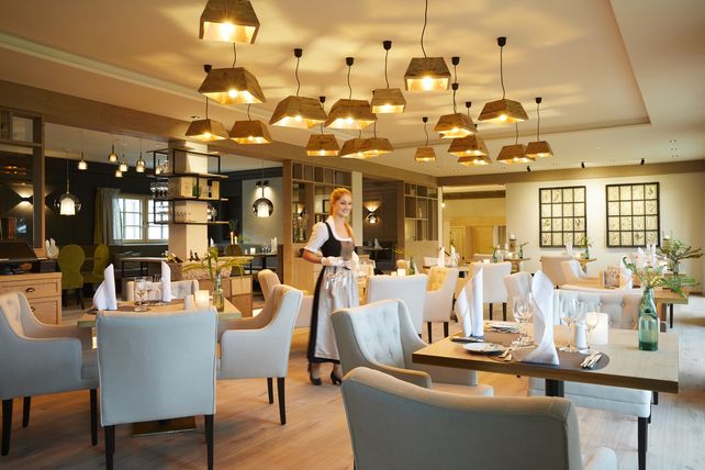 Ab Juni 2018 verwöhnt der Alpenhof seine Gäste auf 110 Quadratmetern mit einem neuen Restaurant. Große Fenster machen hier den Blick auf die Alpen frei und schenken Weite, während kleine Sitznischen und thematische Natur-Stuben den Raum mit Wärme und Gemütlichkeit füllen. Hochwertige Stoffe und Materialen von Leinen und Leder bis hin zu Holz und Felsstein kombiniert mit Schilf und Gräsern holen das Murnauer Moos direkt mit an den Tisch. Neben einer neuinterpretierten Buffet- und Menükultur überrascht der Alpenhof seine Gäste weiterhin mit den kreativen Genuss-Kreationen von Chefkoch Claus Gromotka. Die wichtigsten „Darsteller“ seiner exklusiven Küche sind die hochwertigen Zutaten. Von den heimischen Fischen aus den umliegenden Seen über das Lamm vom Nachbarsbauern bis hin zu bayerischem Urgemüse, das es sonst kaum noch zu finden gibt – im Alpenhof Murnau kommen die Zutaten frisch und aus der Region ins Haus. Auch mit seiner erlesenen Weinkarte überzeugt das Fünf-Sterne-Hotel. Ausgezeichnet mit dem „Wine Spectator's Award of Excellence“ zählt diese mit rund 900 Kompositionen zu den zehn besten Deutschlands. Verkostungen der besonderen Art finden in der hoteleigenen Vinothek statt. Dann gilt es für Kenner und Interessierte die Natur aus den Weinen zu schmecken, sei es die Grasnote eines Sauvignon Blanc oder die Mineralienstufen eines Rieslings.