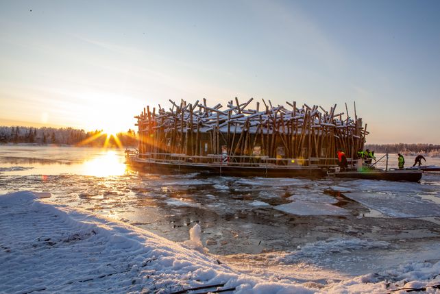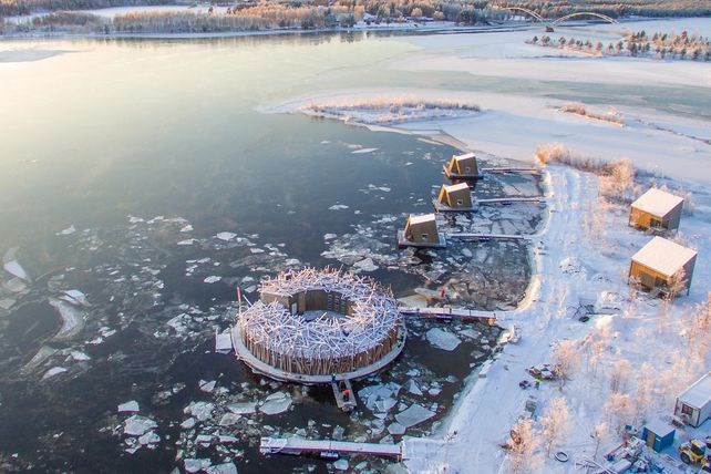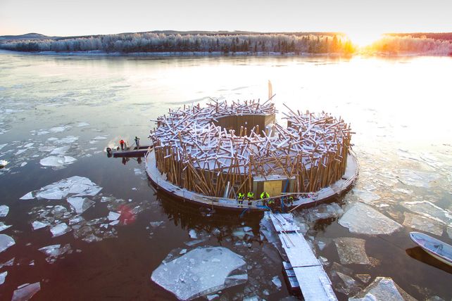 Das Arctic Bath wirkt wie ein überdimensionales Vogelnest, das auf dem Fluss Lule älv treibt. Es fügt sich perfekt in die Landschaft Laplands ein. Die Stadt Harads war einst von der Holzwirtschaft geprägt und der Wald hatte eine enorme Bedeutung für ganz Schweden. Genau daran soll das Design des Wellness-Hotels erinnern, das auf den Plänen der Architekten Bertil Harström und Johan Kauppi beruht.