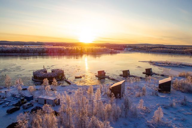 Die kreisförmige Form soll eine geschützte Umgebung schaffen, die zum Sonnen- und Winterbaden einlädt. Hartgesottene können im Winter sogar im vier Grad Celsius kaltem Fluss schwimmen, während das Gewässer rund um das Hotel regelmäßig zugefroren ist. Zum Aufwärmen geht es dann in eine Sauna oder direkt zur Wellnessbehandlung in den Spa-Bereich. Für Abenteuerlustige bietet das Hotel geführte Wanderungen und sogar Elch- und Bärensafaris an.