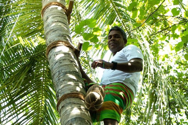 Umrahmt von weißen Sandstränden finden Gäste auf Dhuni Kolhu ein Eco-Resort, dessen exklusiv ausgestattete Villen sich harmonisch in die ursprüngliche Natur der Malediven einfügen. Im Baa-Atoll können die Gäste die farbenfrohe Unterwasserwelt erkunden, mit Mantarochen schnorcheln und sogar Meeresbiologen assistieren, wenn sie frisch geschlüpfte Schildkröten auf ihrem Weg in ein spannendes Leben im Ozean begleiten. Auch ein Blick in die Wipfel der Palmen lohnt sich für die Gäste. Denn es ist gut möglich, dass sie dort oben in schwindelerregender Höhe Haroon Ibrahim, den Toddy Tapper des Resorts (Palmsaft-Sammler) entdecken. Schon als Kind liebte Haroon es, auf Palmen zu klettern und hatte den Wunsch, dieses sehr alte und traditionelle Handwerk zu erlernen. Um den wertvollen Nektar zu gewinnen, ist ein sehr aufwändiger Ernteprozess nötig. Durch das wiederholte Anschneiden von reifen Blütenständen gewinnt er den Saft der Kokosblüte, der dann in einem speziellen Behälter, dem sogenannten Badhi, aufgefangen wird. Dieser wohlschmeckende Saft muss entweder erntefrisch genossen oder zügig weiterverarbeitet werden, da sonst ein natürlicher Gärungsprozess einsetzt.