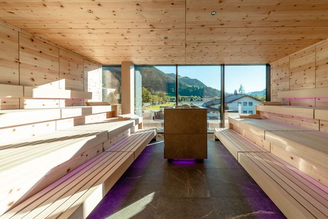 „Uns liegt ein großzügiges Wellnessangebot mit Wasser, Infrarot, Dampfbad, Sole und unterschiedlichen Saunen am Herzen. Familien und Paare sollen sich gleichermaßen wohlfühlen“, sagt Florian Bliem. Durch die räumliche Trennung ist das gelungen. „In der Familien-Textilsauna können Kinder das Saunabaden ausprobieren und Eltern haben von ihr aus die Kinder jederzeit im Auge“, so der Gastgeber.