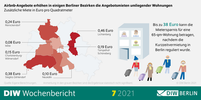 Das im Jahr 2014 beschlossene Zweckentfremdungsverbot-Gesetz hat die Kurzzeitvermietung stark eingegrenzt. Infolgedessen wurden auf dem Mietwohnungsmarkt mehr Wohnungen angeboten, wodurch die Mieten etwas gesunken sind. „Je nach Bezirk kann dies bei einer 65 Quadratmeter großen Wohnung eine monatliche Ersparnis von bis zu 38 Euro ausmachen“, so Studienautor Michelsen.