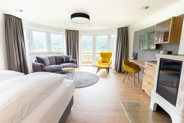 „Wir wollten mit der Einrichtung erreichen, dass unsere Gäste die Natur und die Umgebung, in der sie sich ja den Tag über zum Beispiel beim Wandern aufhalten, auch bei uns im Hotelzimmer wiederfinden. So haben wir bewusst hochwertige, natürliche Materialien und Farben gewählt. Kleine Details wie Karokissen oder die Bettrücken mit der Alpenkulisse vervollständigen dies und satte Farbtupfer lockern alles noch ein wenig auf“, erklärt Riegert das Konzept.