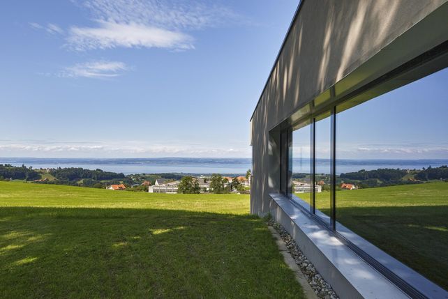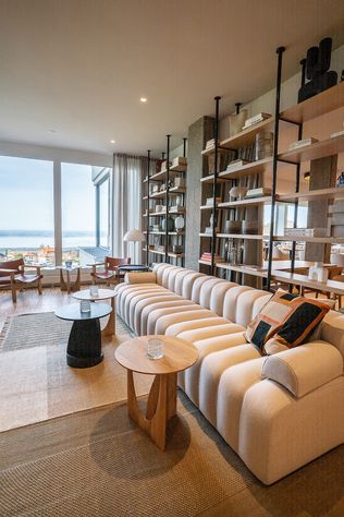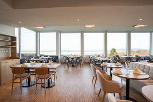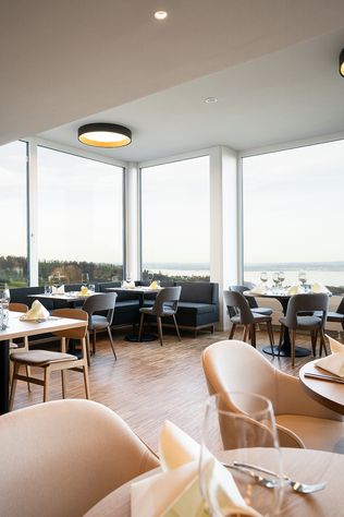 Nun fällt der Blick beim Betreten des Hotels Heiden wieder direkt auf den Bodensee. Das Erdgeschoss präsentiert sich als einladender Begegnungsraum mit dem Restaurant A∞ht, Kaminzimmer, Bar und offener Rezeption.