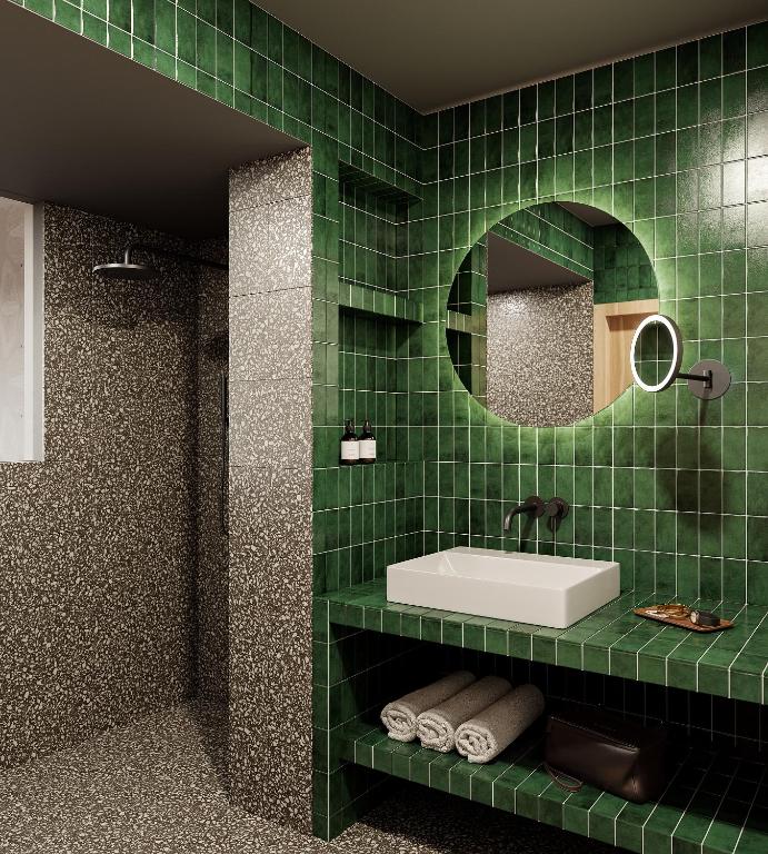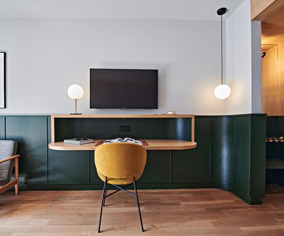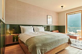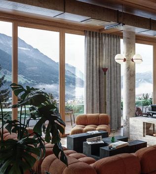 Zu den Design-Highlights zählen eine Wand aus lokalem Sölker-Marmor sowie eine kuratierte Auswahl an Vintage-Fundstücken aus der eigenen Sammlung und von Reisen der Gründer. Im gesamten Haus schaffen Formen und die verwendete Farbpalette eine warme und einladende Atmosphäre - eine Ode an den modernistischen Stil der 1960er und 70er Jahre.