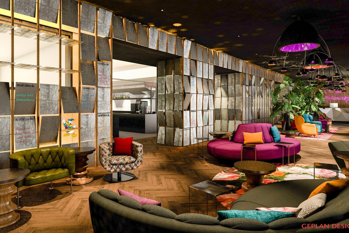 So setzten die Entwickler der Lindner Hotels AG in Zusammenarbeit mit dem Innenarchitekturbüro Geplan Design auf edle Materialien wie Samt, Mohair und Gold. Die Farb- und Formenwelt ist glitzernd, floral, fröhlich bunt-verspielt und üppig gemixt. Leuchtende, von der Decke hängende Mohnblumen in der Kaminlounge, Diamanten und Kristalle in den öffentlichen WCs, die vergoldete Bar und rohe Betonwände, die von einem Streetart-Künstler „märchenhaft“ gestaltet wurden, sind nur ein paar der Hingucker im dritten me and all hotel.