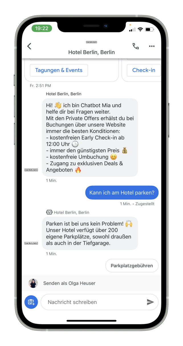 Der Chatbot als virtueller Mitarbeiter ist die optimale Ergänzung zum Hotelteam. Er hilft dabei, potenzielle Gäste dort zu erreichen, wo bereits ein erstes Interesse vorhanden ist – beispielsweise bei Google oder wenn Website-Besucher:innen nach Informationen zum Hotel recherchieren. Der Chatbot kann dann über den Google Chat oder Website Chat häufige Fragen selbständig beantworten, Lust machen auf einen Aufenthalt und Buchungen ermöglichen.