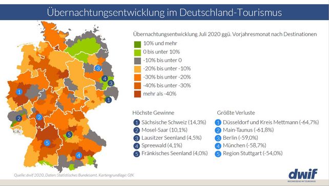 Die Juli-Zahlen des Statistischen Bundesamtes liegen vor. Immerhin zwölf Regionen in Deutschland konnten die Übernachtungszahlen des Vorjahresmonats erreichen oder übertreffen. Die Sächsische Schweiz war im Juli die Destination mit dem höchsten Übernachtungszuwachs in Deutschland. Aber die Daten offenbaren auch weiterhin eklatante Unterschiede zwischen den Destinationen in Deutschland und zeigen, dass die Tourismusbranche noch mitten in der Corona-Krise steckt. Das Statistik-Update des dwif-Corona-Kompass nimmt die Entwicklung in allen 143 Destinationen in den Blick und zeigt auf einer Info-Karte die Regionen mit Gewinnen und Verlusten.