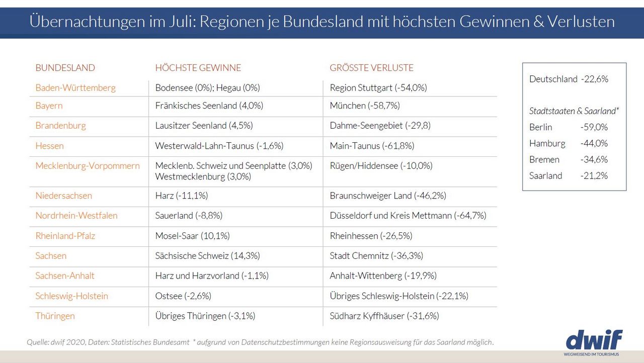 Die Sächsische Schweiz (+14,3 Prozent) und die Region Mosel-Saar (+10,1 Prozent) waren im Juli mit Abstand die Regionen mit den größten relativen Übernachtungszuwächsen in Deutschland. Aber auch einige Regionen in Bayern, Brandenburg, Mecklenburg-Vorpommern und Baden-Württemberg waren endlich wieder im Plus bzw. konnten das Vorjahresniveau halten. Das bedeutet aber auch, dass 131 Regionen weiterhin z. T. deutlich im Minus lagen. In 25 von ihnen war der Übernachtungsrückgang mit weniger als 10 Prozent noch moderat. Harz und Harzvorland in Sachsen-Anhalt (-1,1 Prozent) und Westerwald-Lahn-Taunus in Hessen (-1,6 Prozent) reichten sogar fast wieder an das Vorjahresniveau heran.