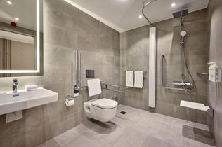 Bei der Ankunft werden die Gäste in einer Lobby empfangen, die dank ihres Glasdachs von Tageslicht durchflutet wird. Im Eingangsbereich erhebt sich eine Säule, verkleidet mit Eichenholzlamellen, die von Sitzgelegenheiten mit kleinen Tischen und Steckdosen umgeben ist. Abends werden die Sitzgelegenheiten von einem Beleuchtungssystem ausgeleuchtet, was den Wohlfühlfaktor zusätzlich steigern soll. Darüber hinaus haben die Gäste neben den Aufzügen die Möglichkeit, auf Sitzbänken Platz zu nehmen.