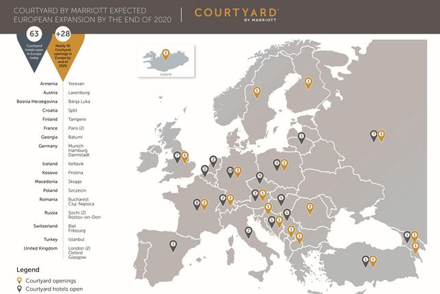 Courtyard wird zudem innerhalb der kommenden zwei Jahre voraussichtlich in zahlreichen Ländern neu Fuß fassen, darunter Rumänien (Cluj-Napoca, Bukarest Floreasca), Armenien (Jerewan), Kroatien (Split), Finnland (Tampere), Island (Keflavík), Georgien (Batumi) sowie Mazedonien (Skopje).