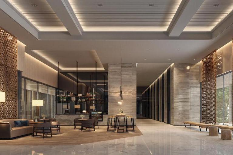 Zu den Einrichtungen gehören ein ganztägig geöffnetes Restaurant, eine Lounge und eine Bar, ein Lobbybereich mit zentraler Videowand, ein begrüntes Pooldeck, ein Fitnesscenter und Ladestationen für Elektrofahrzeuge.