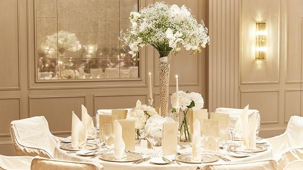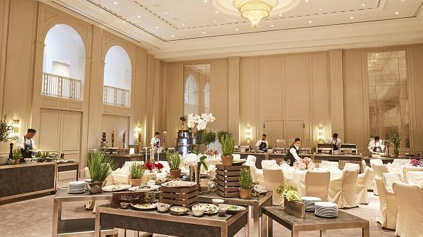 Inspiriert von historischen Ballsälen, fiel die Wahl auf opulente Kronleuchter, weichen Teppichboden in der Optik von Versailles-Parkett und riesige Spiegel, was zunächst nicht allzu außergewöhnlich erscheint. Dahinter aber stehen die weltweit Besten ihres Faches. Wie schon in der Adlon-Lobby kommen auch die tonnenschweren Lüster und großen Wandleuchten des neuen Ballsaals von Venini, den Glaskünstlern aus Murano. Sie tauchen den Saal in ein warmes, authentisches Licht. Der Anblick des Teppichs versetzt den Betrachter in eine Ballnacht auf dem Schloss Versailles, so detailgetreu wurde er dessen Parkett nachempfunden. Im Adlon fiel die Entscheidung gegen Holzparkett und für die geknüpfte Alternative aus Gründen der Akustik. Geschaffen wurde dieses Meisterwerk der Teppichkunst vom „House of Tai Ping“, einer international bekannten Teppichmanufaktur in Hongkong.