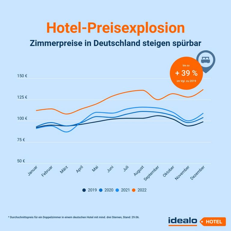 Durchschnittlich liegt die Preissteigerung dieses Jahr im Vergleich zu 2019 bei 26 Prozent. Im Vergleich zu 2021 sind die Preise durchschnittlich 19 Prozent gestiegen; auch der Vergleich mit dem Jahr 2020 zeigt mit 21 Prozent einen spürbaren Anstieg. Laut Sandra Dotan vom Flug- und Hotelpreisvergleich bei idealo zeige die Auswertung, "dass die Hotelpreise im Schnitt in Deutschland dieses Jahr schon seit Januar deutlich angestiegen sind, über 20 Prozent sind es in der Regel."